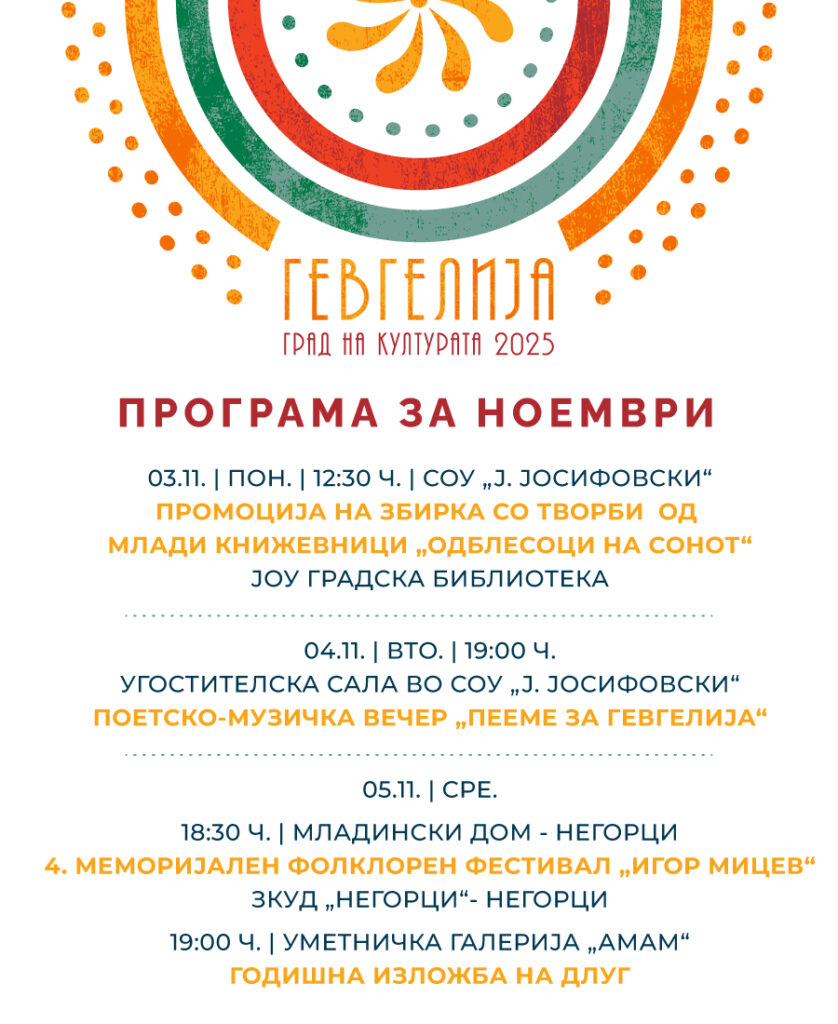 04.11. / ВТО. / 19:00 Ч. / УГОСТИТЕЛСКА САЛА ВО СОУ „Ј. ЈОСИФОВСКИ“ – ПОЕТСКО-МУЗИЧКА ВЕЧЕР „ПЕЕМЕ ЗА ГЕВГЕЛИЈА“