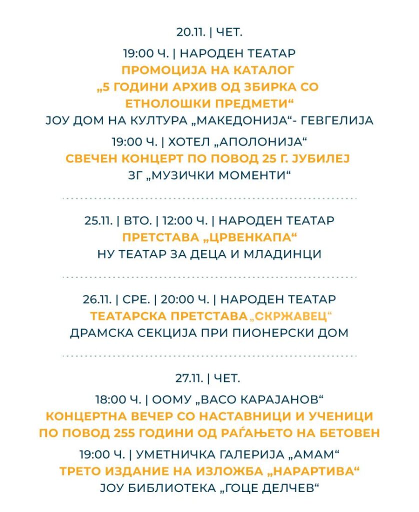 20.11. / ЧЕТ. / 19:00 Ч. / НАРОДЕН ТЕАТАР – ПРОМОЦИЈА НА КАТАЛОГ „5 ГОДИНИ АРХИВ ОД ЗБИРКА СО ЕТНОЛОШКИ ПРЕДМЕТИ“, ЈОУ ДОМ НА КУЛТУРА „МАКЕДОНИЈА“- ГЕВГЕЛИЈА
