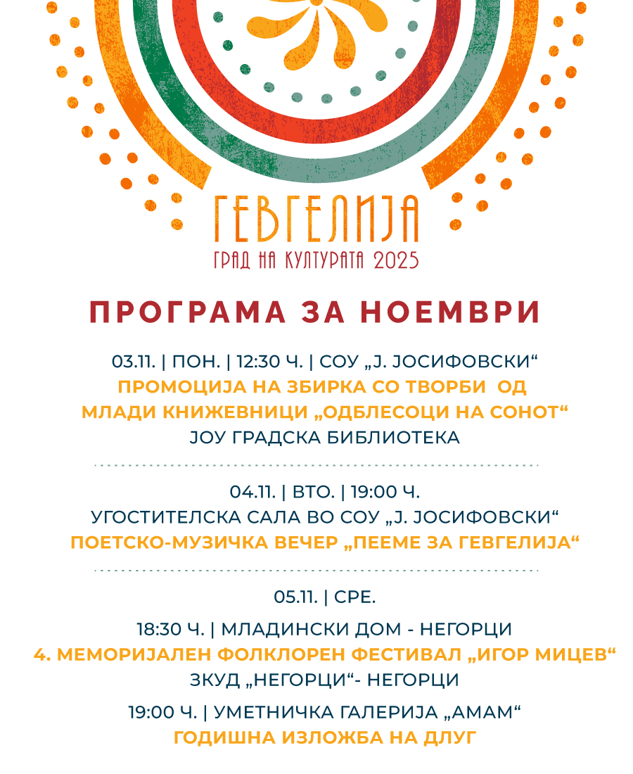 04.11. / ВТО. / 19:00 Ч. / УГОСТИТЕЛСКА САЛА ВО СОУ „Ј. ЈОСИФОВСКИ“ – ПОЕТСКО-МУЗИЧКА ВЕЧЕР „ПЕЕМЕ ЗА ГЕВГЕЛИЈА“
