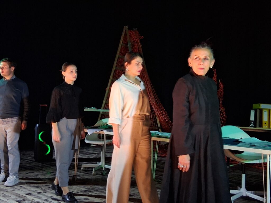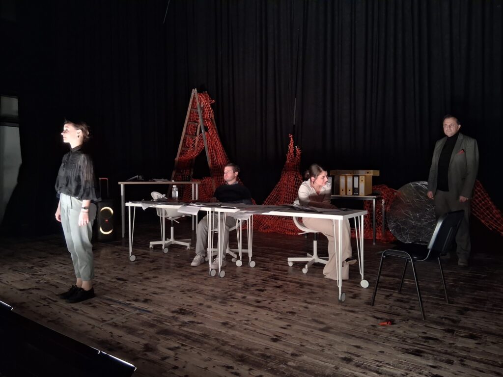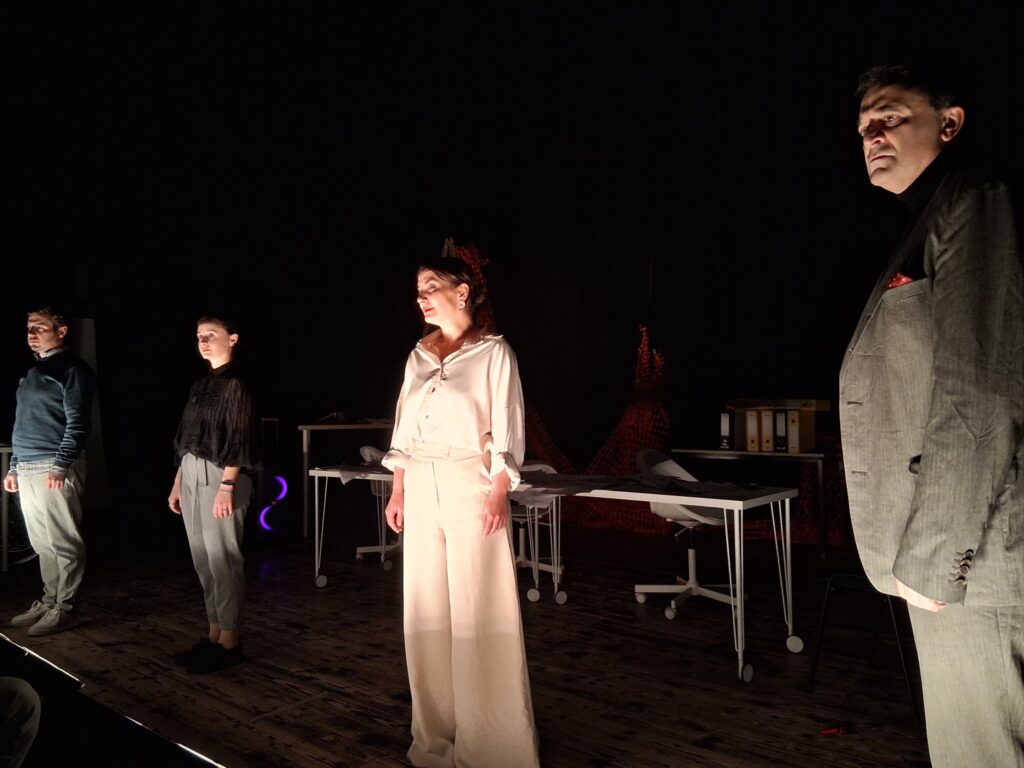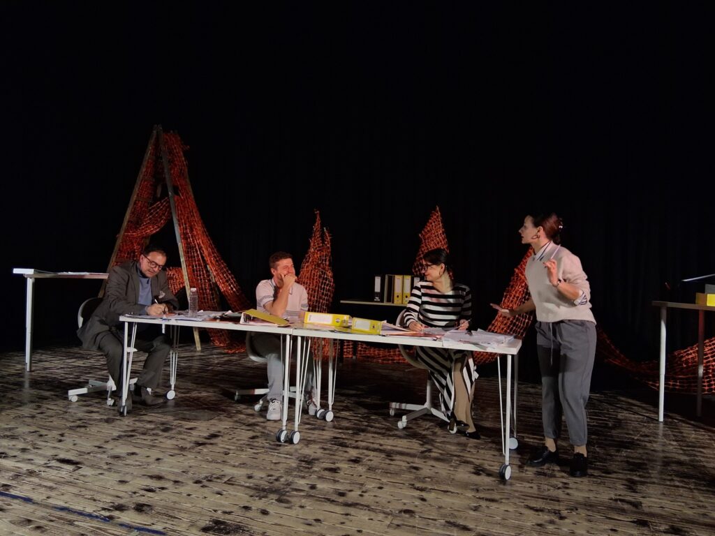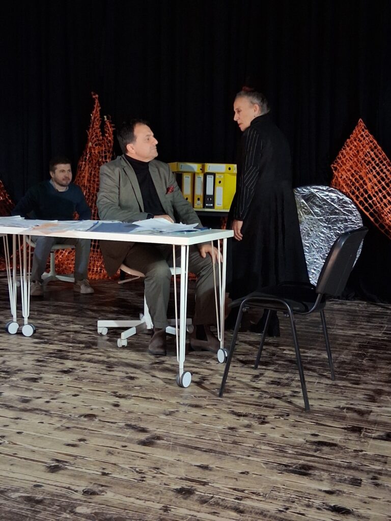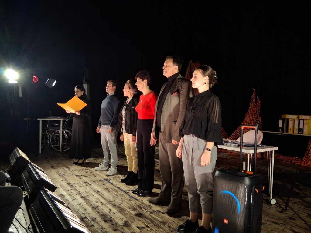 Актерскиот ансамбл- Марија Стефановска, Наталија Ристевска, Соња Михајлова, Никола Пројчевски и Петар Горко, чија актерска игра беше беспрекорна, го играа системот. Бирократијата, затворените врати, тешките процедури, административните ќор-сокаци, формалностите без душа- сето тоа доби човечки лик пред публиката. Актерите ја изведоа токму онаа сила која најчесто им стои на пат на овие луѓе, симболично претставувајќи ја борбата меѓу индивидуата и механизмите што ја гушат. За семејното насилство – болка што премногу често останува зад затворени врати. Меѓу темите што ја потресоа публиката беше и семејното насилство – слушано директно од жени кои преживеале долги години молк, страв и институционално чекање. Овој сегмент од претставата особено силно кореспондираше со тековниот период на кампањата „16 дена активизам против родово базирано насилство“, потсетувајќи дека овие приказни не се статистика, туку реални животи кои продолжуваат да страдаат зад затворени врати.