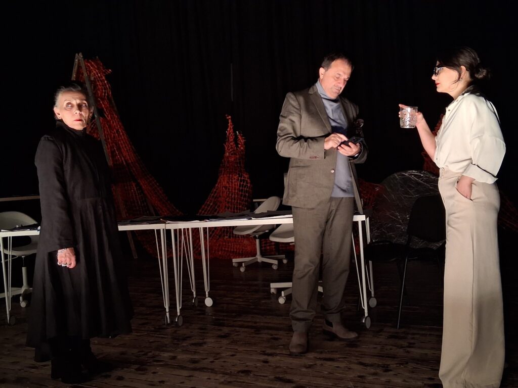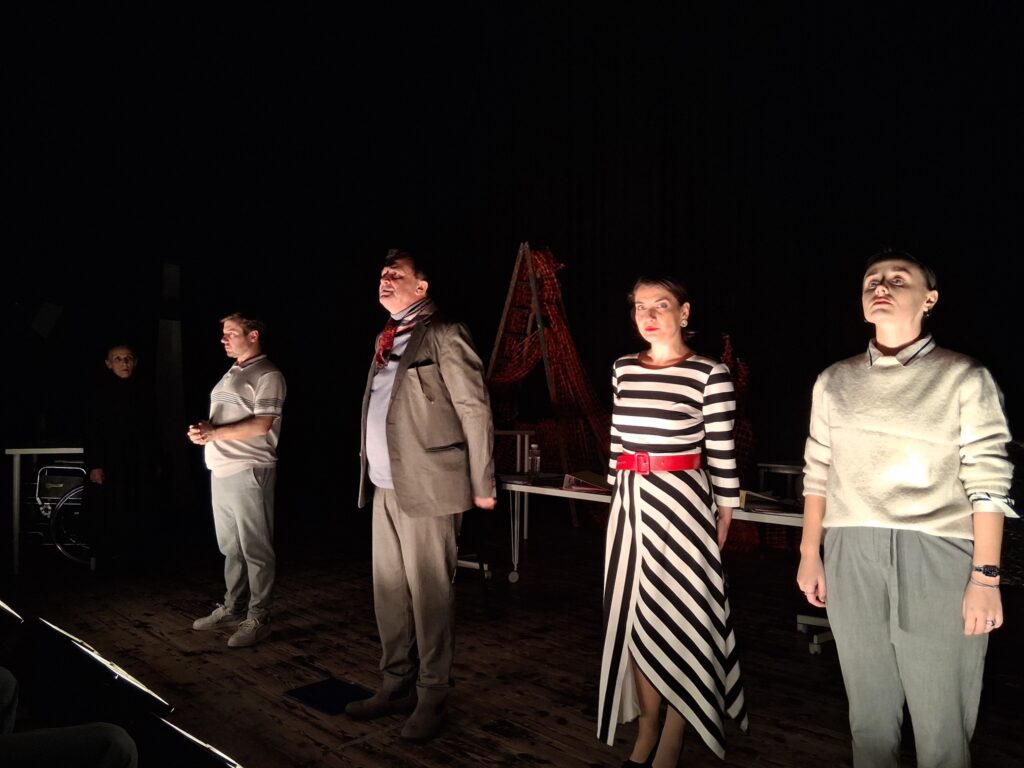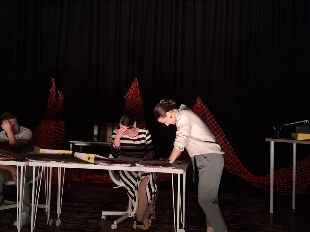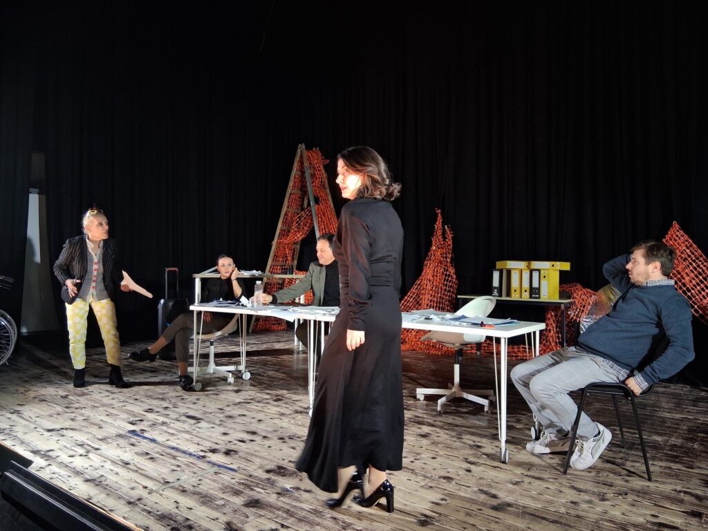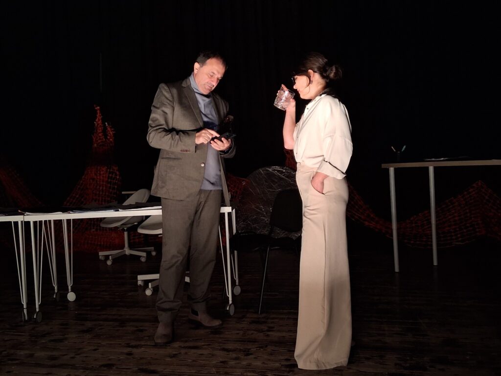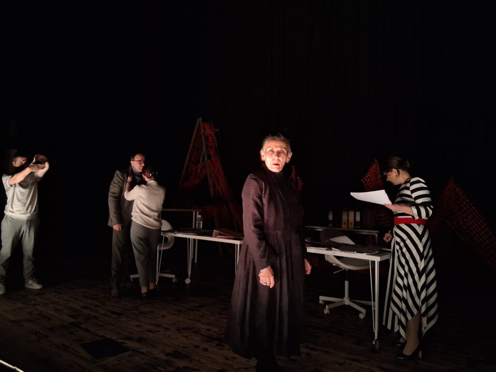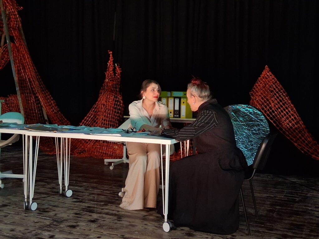 Актерскиот ансамбл- Марија Стефановска, Наталија Ристевска, Соња Михајлова, Никола Пројчевски и Петар Горко, чија актерска игра беше беспрекорна, го играа системот. Бирократијата, затворените врати, тешките процедури, административните ќор-сокаци, формалностите без душа- сето тоа доби човечки лик пред публиката. Актерите ја изведоа токму онаа сила која најчесто им стои на пат на овие луѓе, симболично претставувајќи ја борбата меѓу индивидуата и механизмите што ја гушат. За семејното насилство – болка што премногу често останува зад затворени врати. Меѓу темите што ја потресоа публиката беше и семејното насилство – слушано директно од жени кои преживеале долги години молк, страв и институционално чекање. Овој сегмент од претставата особено силно кореспондираше со тековниот период на кампањата „16 дена активизам против родово базирано насилство“, потсетувајќи дека овие приказни не се статистика, туку реални животи кои продолжуваат да страдаат зад затворени врати.