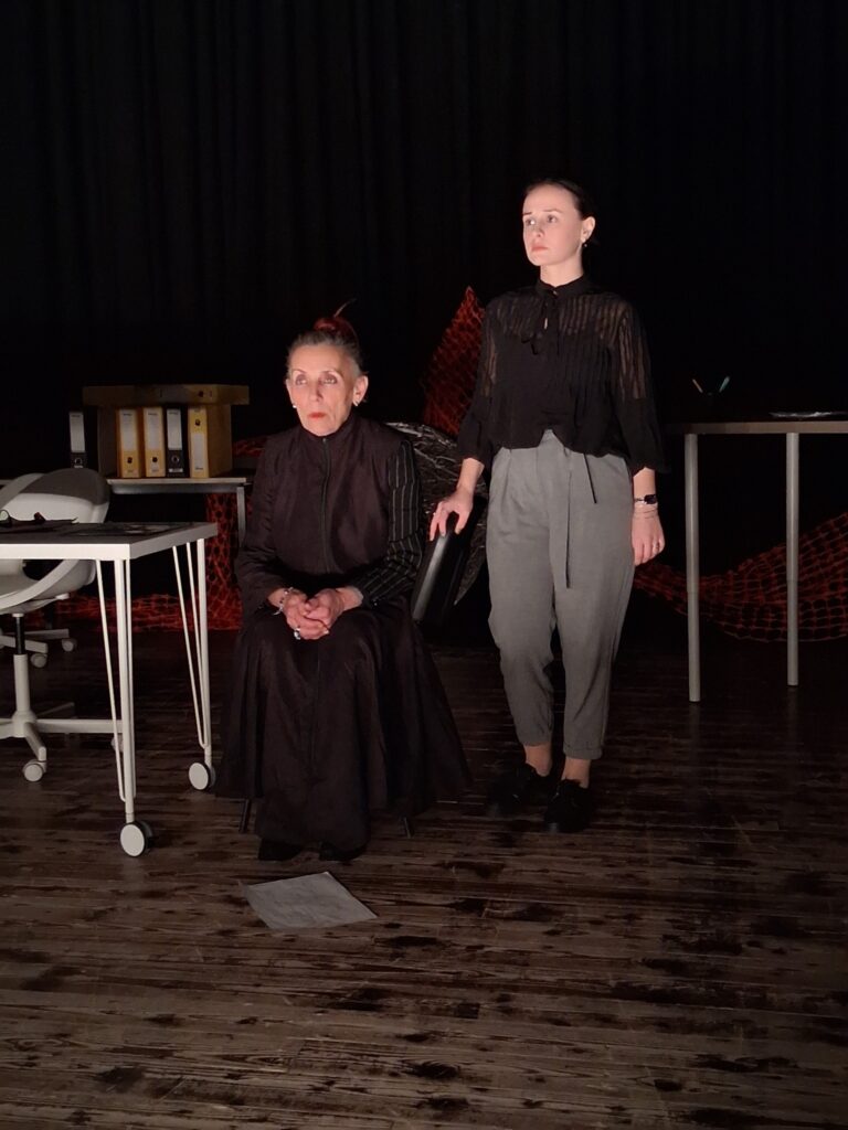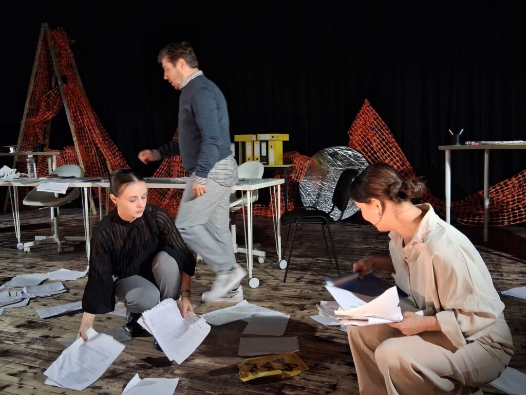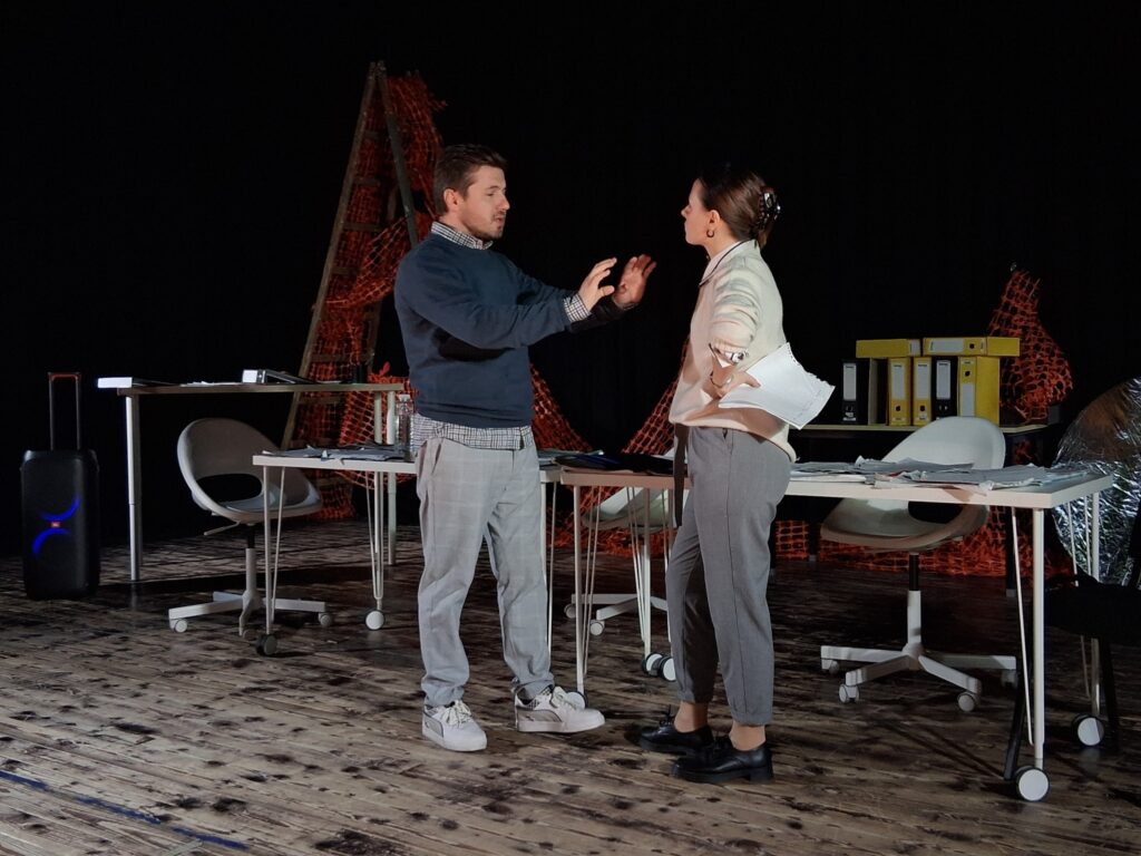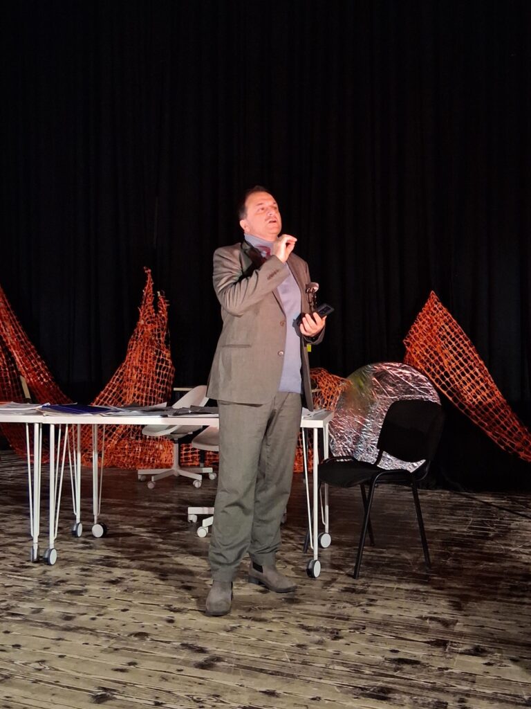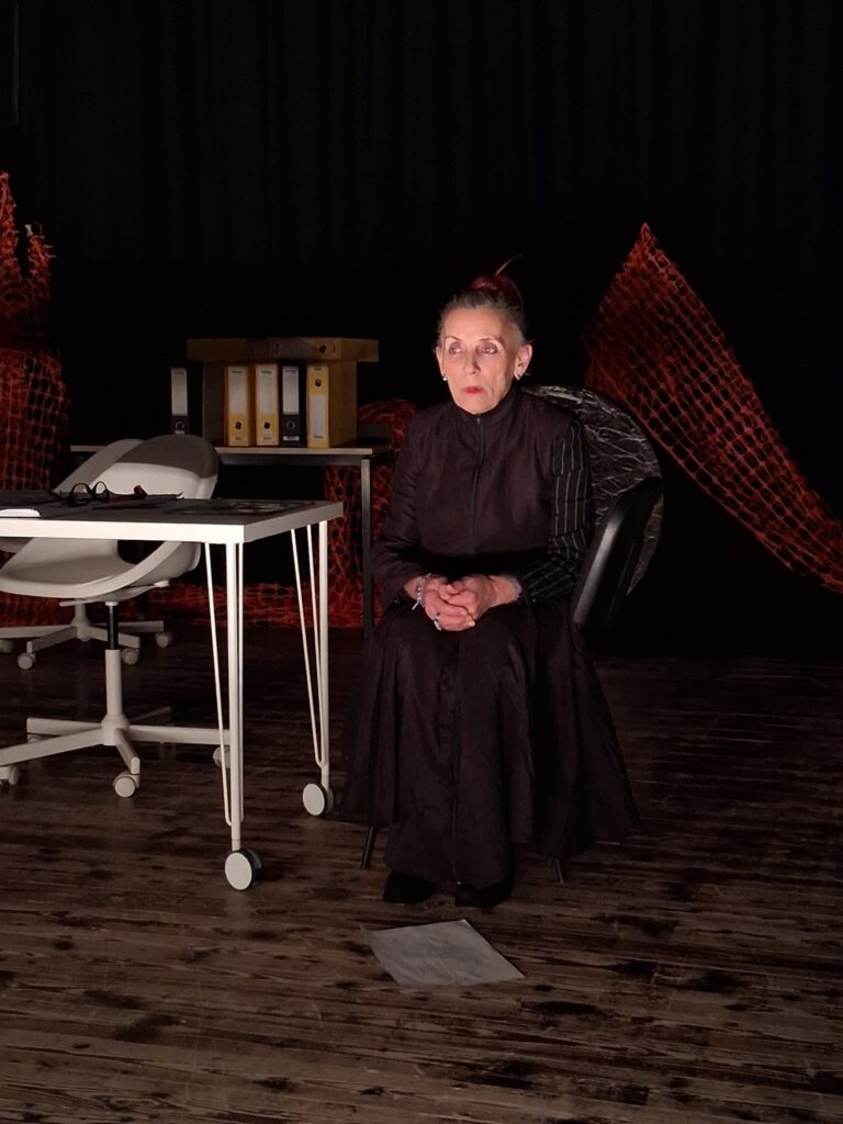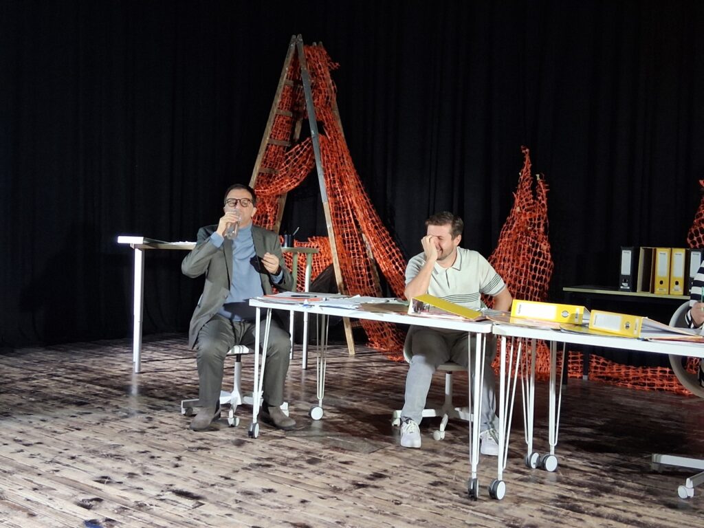 Актерскиот ансамбл- Марија Стефановска, Наталија Ристевска, Соња Михајлова, Никола Пројчевски и Петар Горко, чија актерска игра беше беспрекорна, го играа системот. Бирократијата, затворените врати, тешките процедури, административните ќор-сокаци, формалностите без душа- сето тоа доби човечки лик пред публиката. Актерите ја изведоа токму онаа сила која најчесто им стои на пат на овие луѓе, симболично претставувајќи ја борбата меѓу индивидуата и механизмите што ја гушат. За семејното насилство – болка што премногу често останува зад затворени врати. Меѓу темите што ја потресоа публиката беше и семејното насилство – слушано директно од жени кои преживеале долги години молк, страв и институционално чекање. Овој сегмент од претставата особено силно кореспондираше со тековниот период на кампањата „16 дена активизам против родово базирано насилство“, потсетувајќи дека овие приказни не се статистика, туку реални животи кои продолжуваат да страдаат зад затворени врати.