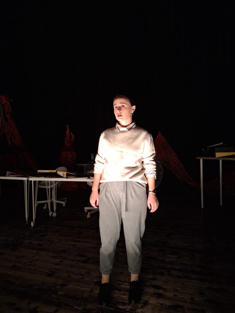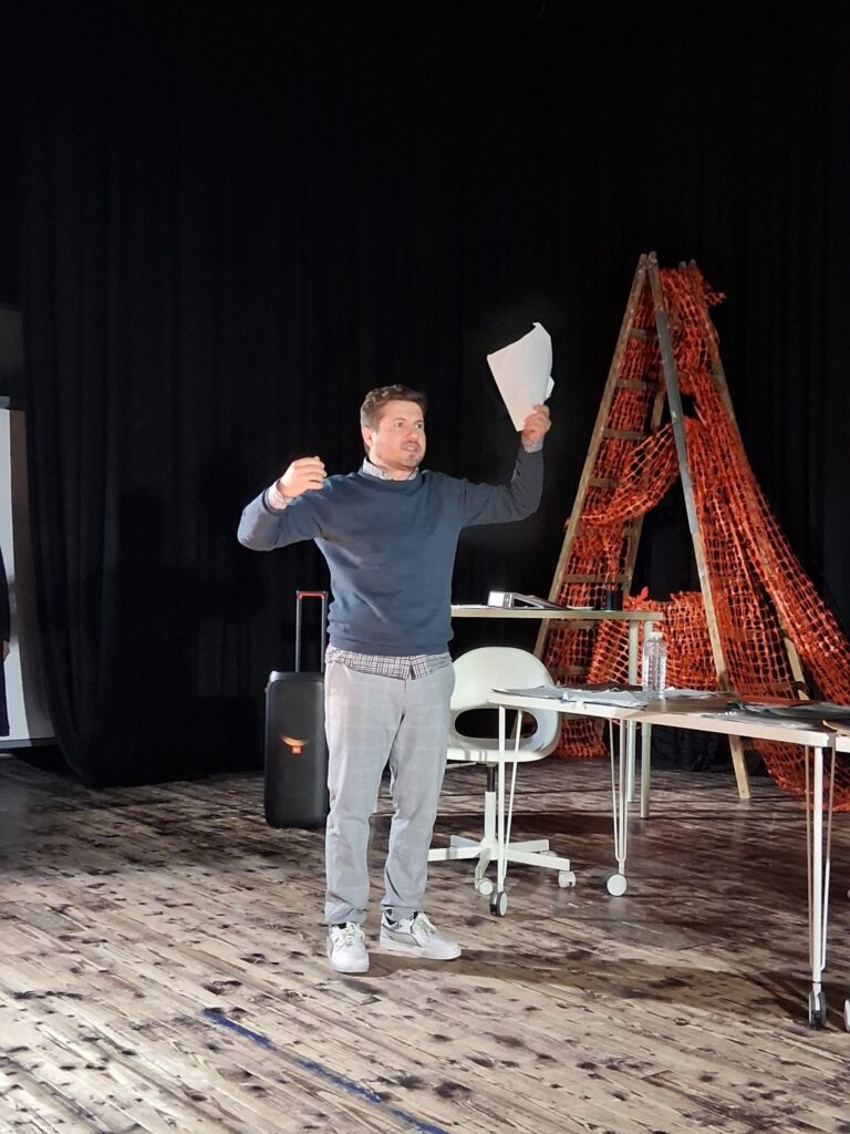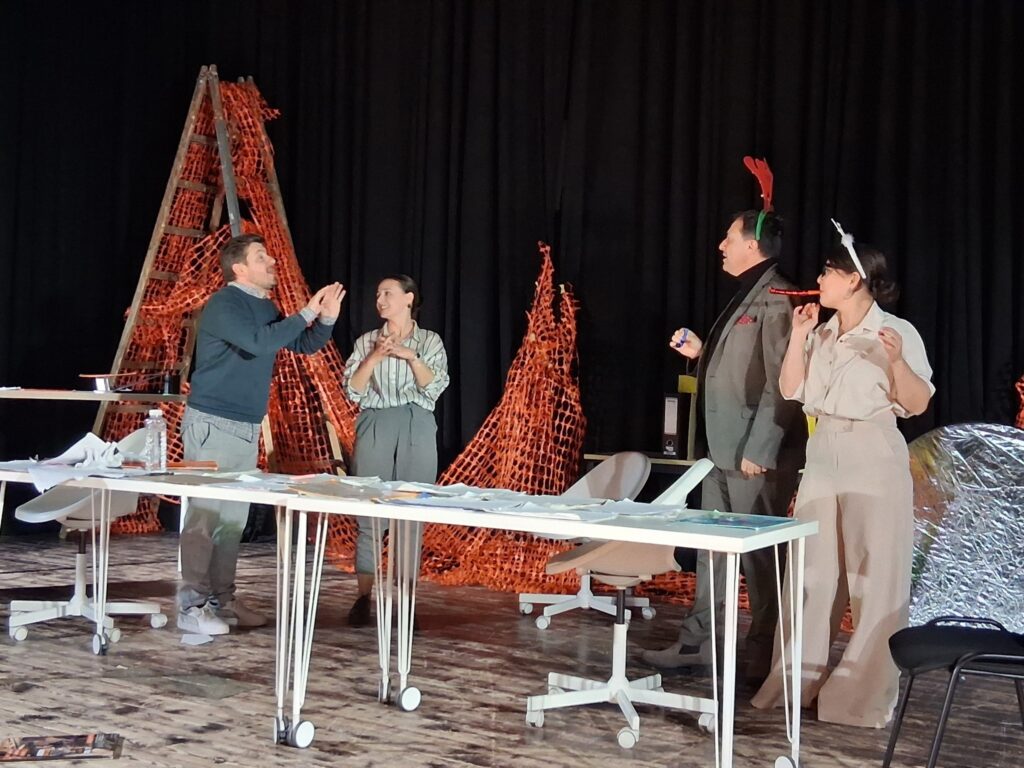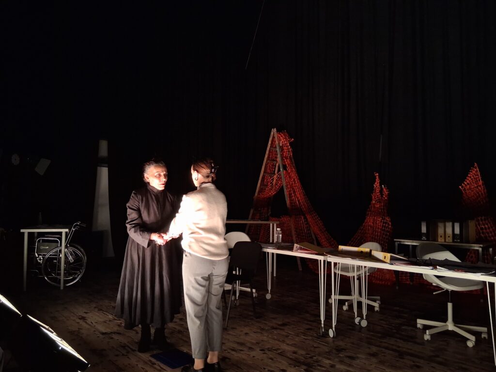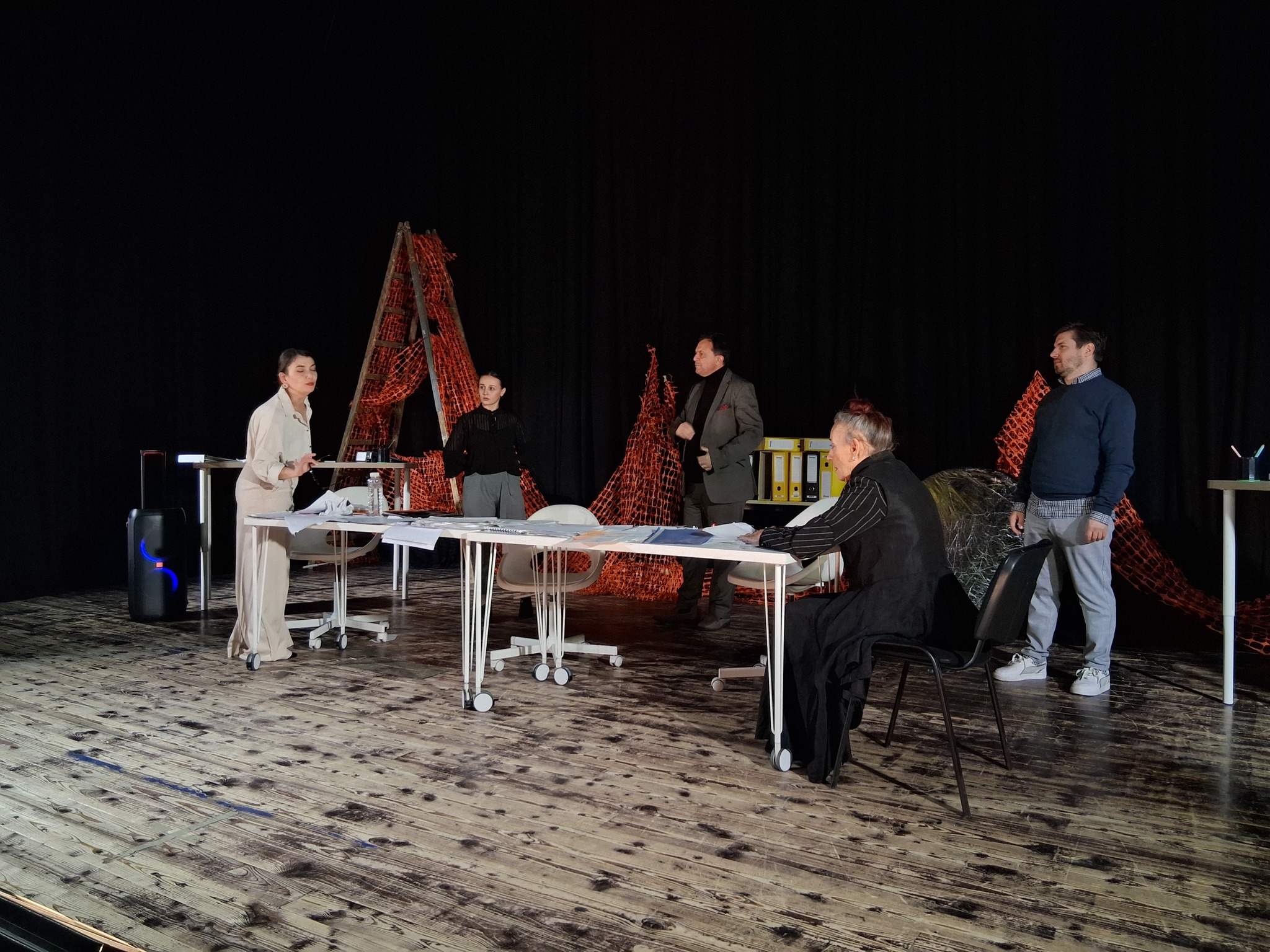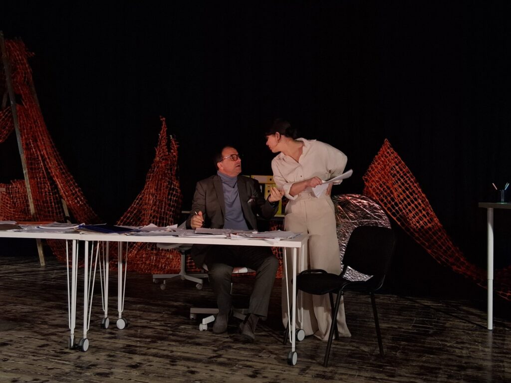 Актерскиот ансамбл- Марија Стефановска, Наталија Ристевска, Соња Михајлова, Никола Пројчевски и Петар Горко, чија актерска игра беше беспрекорна, го играа системот. Бирократијата, затворените врати, тешките процедури, административните ќор-сокаци, формалностите без душа- сето тоа доби човечки лик пред публиката. Актерите ја изведоа токму онаа сила која најчесто им стои на пат на овие луѓе, симболично претставувајќи ја борбата меѓу индивидуата и механизмите што ја гушат. За семејното насилство – болка што премногу често останува зад затворени врати. Меѓу темите што ја потресоа публиката беше и семејното насилство – слушано директно од жени кои преживеале долги години молк, страв и институционално чекање. Овој сегмент од претставата особено силно кореспондираше со тековниот период на кампањата „16 дена активизам против родово базирано насилство“, потсетувајќи дека овие приказни не се статистика, туку реални животи кои продолжуваат да страдаат зад затворени врати.