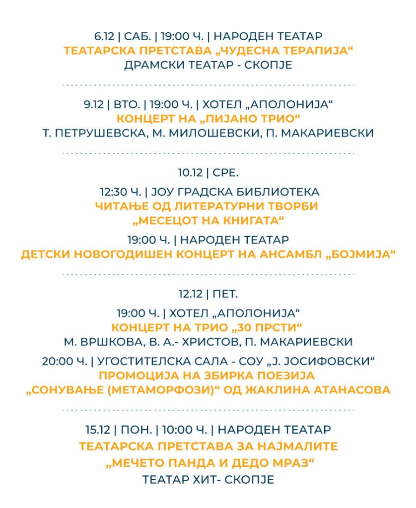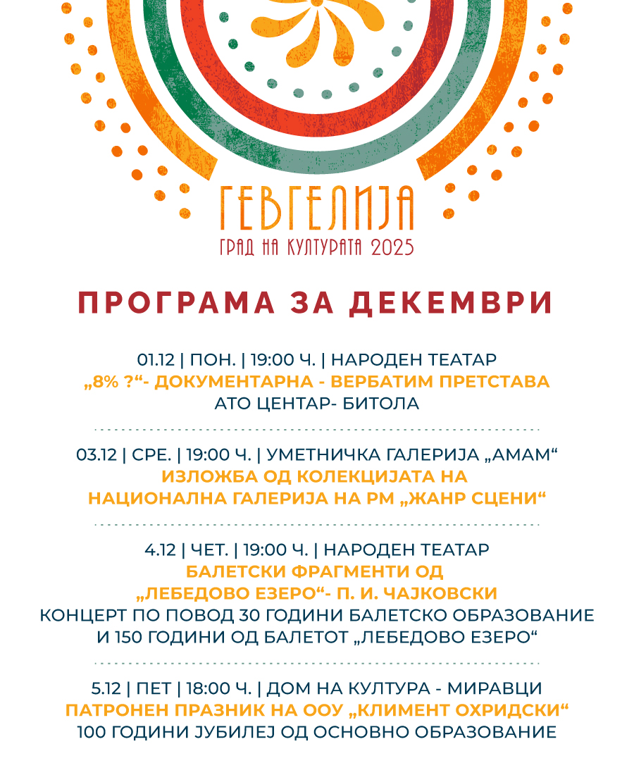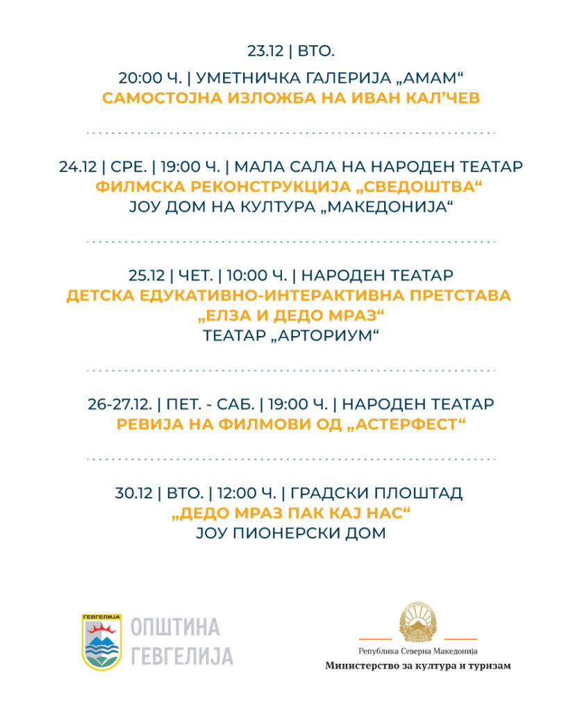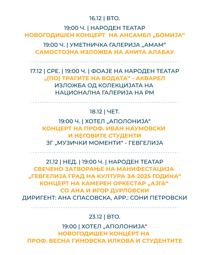 21.12 / НЕД. / 19:00 Ч. / НАРОДЕН ТЕАТАР – СВЕЧЕНО ЗАТВОРАЊЕ НА МАНИФЕСТАЦИЈА „ГЕВГЕЛИЈА ГРАД НА КУЛТУРА ЗА 2025 ГОДИНА“ КОНЦЕРТ НА КАМЕРЕН ОРКЕСТАР „АЈГА“ СО АНА И ИГОР ДУРЛОВСКИ, ДИРИГЕНТ: АНА СПАСОВСКА, АРР.: СОНИ ПЕТРОВСКИ