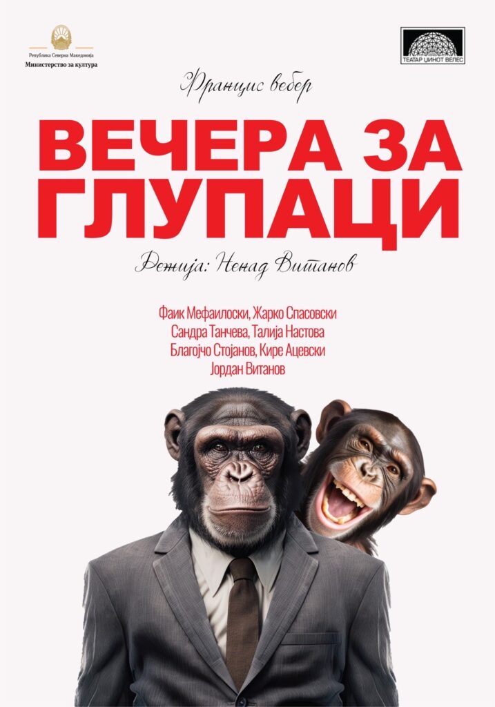 Хит-комедијата „Вечера за глупаци“ е приказна која го коментира високото француско општество кое презаситено од сè што може да си пружи, креира ситуации во кои ќе може да им се исмева на послабите и понеуспешните од нив. Имено, темата која се обработува е смислата на она што го чини човекот среќен и перспективата од која тоа се доживува. Од НУ Театар „Ј.Х.К. Џинот“- Велес велат гевгеличани да се подготват за вечер исполнета со смеење, изненадувања и апсурди кои ќе ги држат приковани за седиштата до последната сцена.