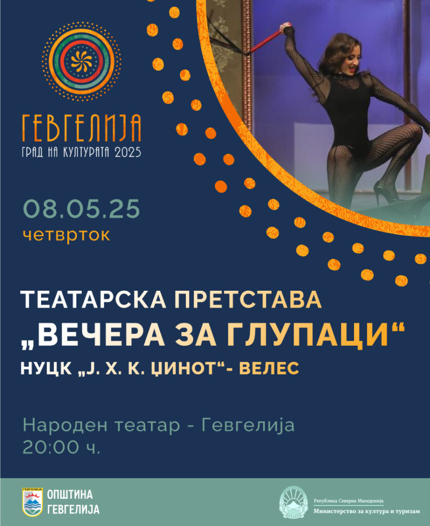 На 8 мај 2025 година (четврток), по повод „Гевгелија град на културата за 2025 година“, во Народниот театар- Гевгелија, ќе гостува НУ Театар „Јордан Хаџи Константинов- Џинот“ со претставата „Вечера за глупаци“. Изведбата ќе започне во 20:00 часот, а влезот е слободен.