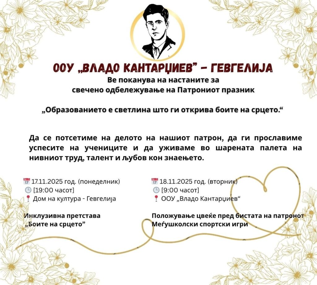 По повод Патрониот празник на ООУ „Владо Кантарџиев“- Гевгелија, на 17 ноември 2025 година (понеделник) во Народниот театар- Гевгелија, со почеток во 19:00 часот, ќе се одржи свечена културно-уметничка програма под мотото „Образованието е светлина што ги открива боите на срцето“.