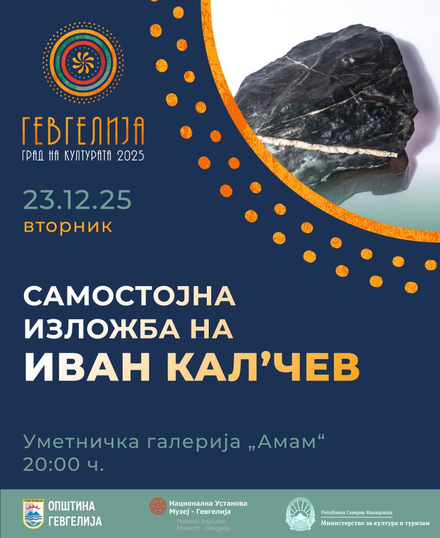 Утре, 23 декември 2025 година, со почеток во 20:00 часот, во Уметничката галерија „Амам“ во Гевгелија ќе биде отворена самостојната изложба на гевгелискиот визуелен уметник, Иван Кал’чев, посветена на уметноста на суисеки- древна визуелна и духовна практика која ја слави природата во нејзината најчиста форма. Настанот е дел од програмата „Гевгелија град на културата 2025“ и претставува значаен културен настан кој ја збогатува локалната и националната уметничка сцена.