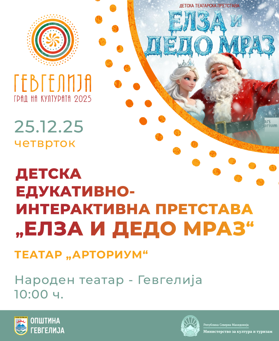 Во рамките на манифестацијата „Гевгелија град на културата за 2025 година“, на 25 декември 2025 година (четврток), со почеток во 10:00 часот, во Народниот театар- Гевгелија, најмладата публика ќе има можност да ужива во детската едукативно-интерактивна театарска претстава „Елза и Дедо Мраз“, во изведба на Театар „Арториум“- Скопје. Влезот е слободен.