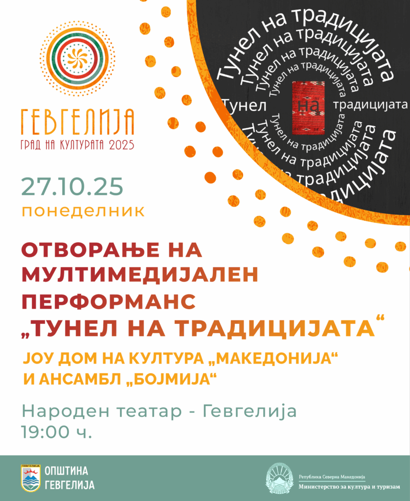 На 27 октомври 2025 година (понеделник), со почеток во 19:00 часот, во Народниот театар во Гевгелија, ќе се одржи отворањето на мултимедијалниот перформанс „Тунел на традицијата“, во организација на ЈОУ Дом на култура „Македонија“- Гевгелија и Ансамбл „Бојмија“- Гевгелија. Настанот е дел од богатата годишна програма на манифестацијата „Гевгелија град на културата за 2025 година“, поддржана од Министерството за култура и туризам и Општина Гевгелија.