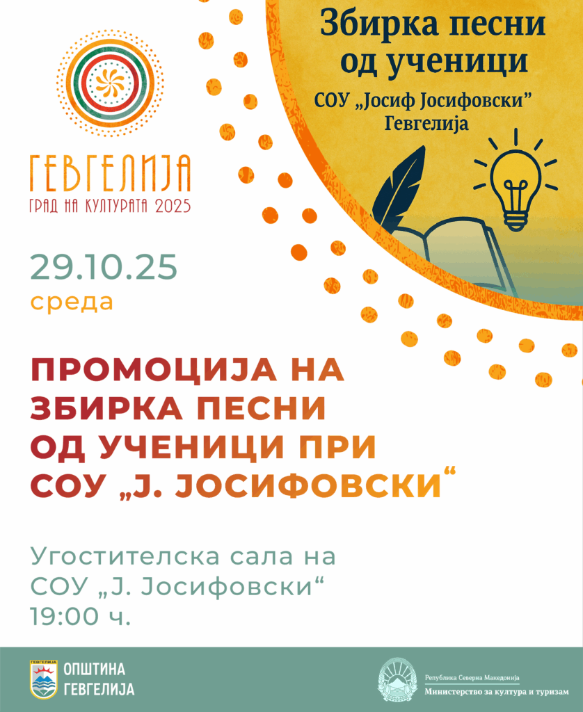 Во рамките на програмата „Гевгелија град на културата за 2025 година“, на 29 октомври (среда), со почеток во 19:00 часот, во Угостителската сала на СОУ „Јосиф Јосифовски“, ќе се одржи промоција на збирка песни од ученици при Училиштето, насловена „Многугласие“. Настанот претставува уште едно сведоштво за творечката енергија и уметничкиот израз на младите генерации во Гевгелија.