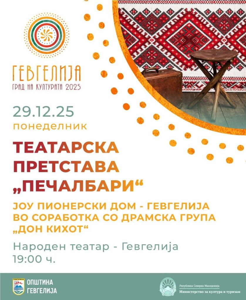 Во рамките на манифестацијата „Гевгелија град на културата за 2025 година“, на 29 декември 2025 година (понеделник), со почеток во 19:00 часот, на сцената во Народниот театар- Гевгелија, премиерно ќе биде изведена театарската претстава „Печалбари“, во продукција на ЈОУ Пионерски дом „Јосип Броз Тито“- Гевгелија, во соработка со Драмската група „Дон Кихот“. Влезот е слободен.