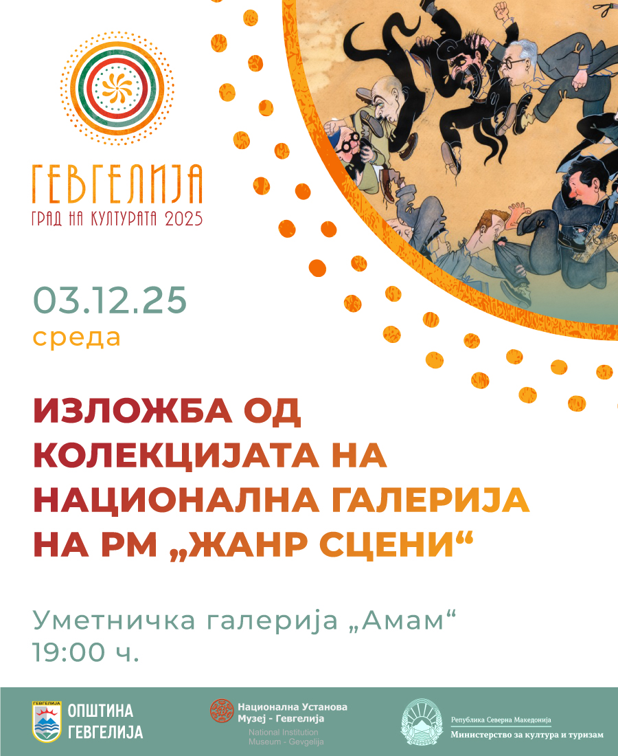 Во рамки на програмата „Гевгелија град на културата за 2025 година“, Општина Гевгелија во соработка со ЈОУ Дом на култура „Македонија“- Гевгелија и НУ Музеј- Гевгелија ја најавуваат изложбата „Жанр сцени“- избор од богата и вредна колекција на Националната галерија на Република Македонија. Настанот претставува ретка можност гевгелиската јавност да види дела што инаку се чуваат во депоата на Националната галерија, а кои носат висока историска, естетска и културолошка вредност.