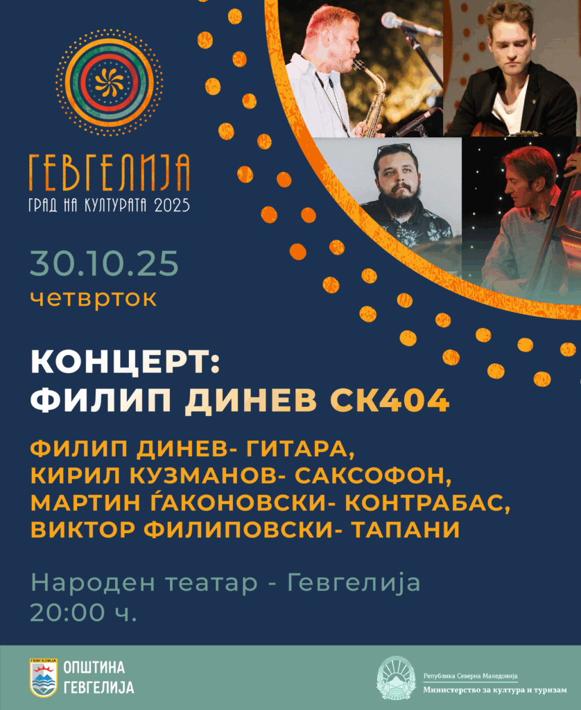 Во рамките на програмата „Гевгелија град на културата за 2025 година“, на 30 октомври 2025 година (четврток), со почеток во 20:00 часот, во Народниот театар- Гевгелија, ќе се одржи авторски концерт на м-р Филип Динев- „СК404“. Познатиот македонски гитарист и композитор, Филип Динев, ќе ѝ се претстави на својата родна публика во Гевгелија со оригинални композиции создадени во негов препознатлив стил. Настапот ќе биде реализиран во квартет форма, заедно со  м-р Кирил Кузманов на саксофон, Мартин Ѓаконовски- Шпато на контрабас и м-р Виктор Филиповски на тапани, највиртуозните и најбарани џез-инструменталисти во Македонија.