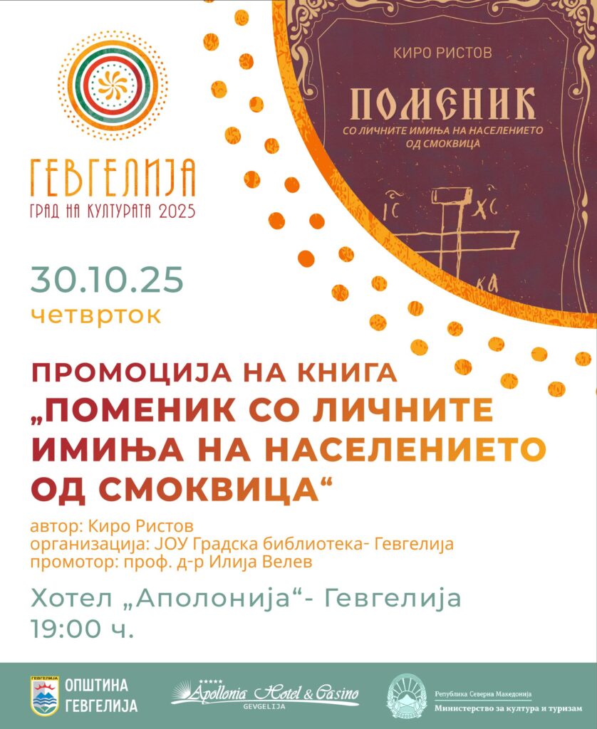 Во рамките на програмата „Гевгелија град на културата за 2025 година“, на 30 октомври (четврток), со почеток во 19:00 часот, во хотел „Аполонија“ во Гевгелија, ќе се одржи промоција на книгата „Поменик со личните имиња на населението од Смоквица“, автор м-р Киро Ристов. Настанот е во организација на ЈОУ Библиотека „Гоце Делчев“- Гевгелија, со поддршка од Општина Гевгелија. Промотор на книгата ќе биде проф. д-р Илија Велев, познат истражувач, автор и универзитетски професор, кој со своето научно и книжевно дело дава значаен придонес во афирмацијата на македонското културно и духовно наследство. Настанот ќе биде збогатен со музички настап на Теодора Гошева – Теда, која со својот интерпретативен израз ќе даде уметничка нота на оваа промотивна вечер посветена на културното и историското наследство на Смоквица.