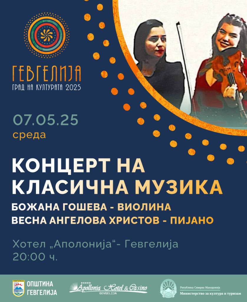 Утре (7 мај 2025 година), во рамки на манифестацијата „Гевгелија град на културата за 2025 година“, следува Концерт на Божана Гошева- виолина во пијано-придружба на Весна Ангелова Христов. Во хотел „Аполонија“, со почеток во 20:00 часот, ќе бидат изведени дела од Моцарт, Зографски, Паганини, Бах, Виењавски и Сарасете.